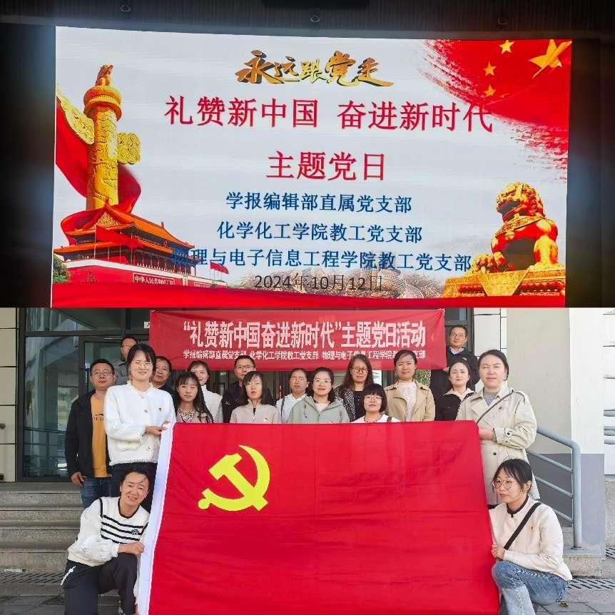 10月12日下午,化学化工学院教工党支部与物理与电子信息工程学院教工党支部、学报编辑部直属党支部在马克思主义学院VR教室联合开展“礼赞新中国,奋进新时代”主题党日活动,活动由化学化工学院党总支副书记鲁芳主持。